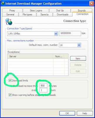 Klik pada bahagian Downloads lalu pilih ► Speed Limiter ► Settings… ► isikan pada bahagian Maximum download speed for one file dengan angka ► 50000 & klik OK