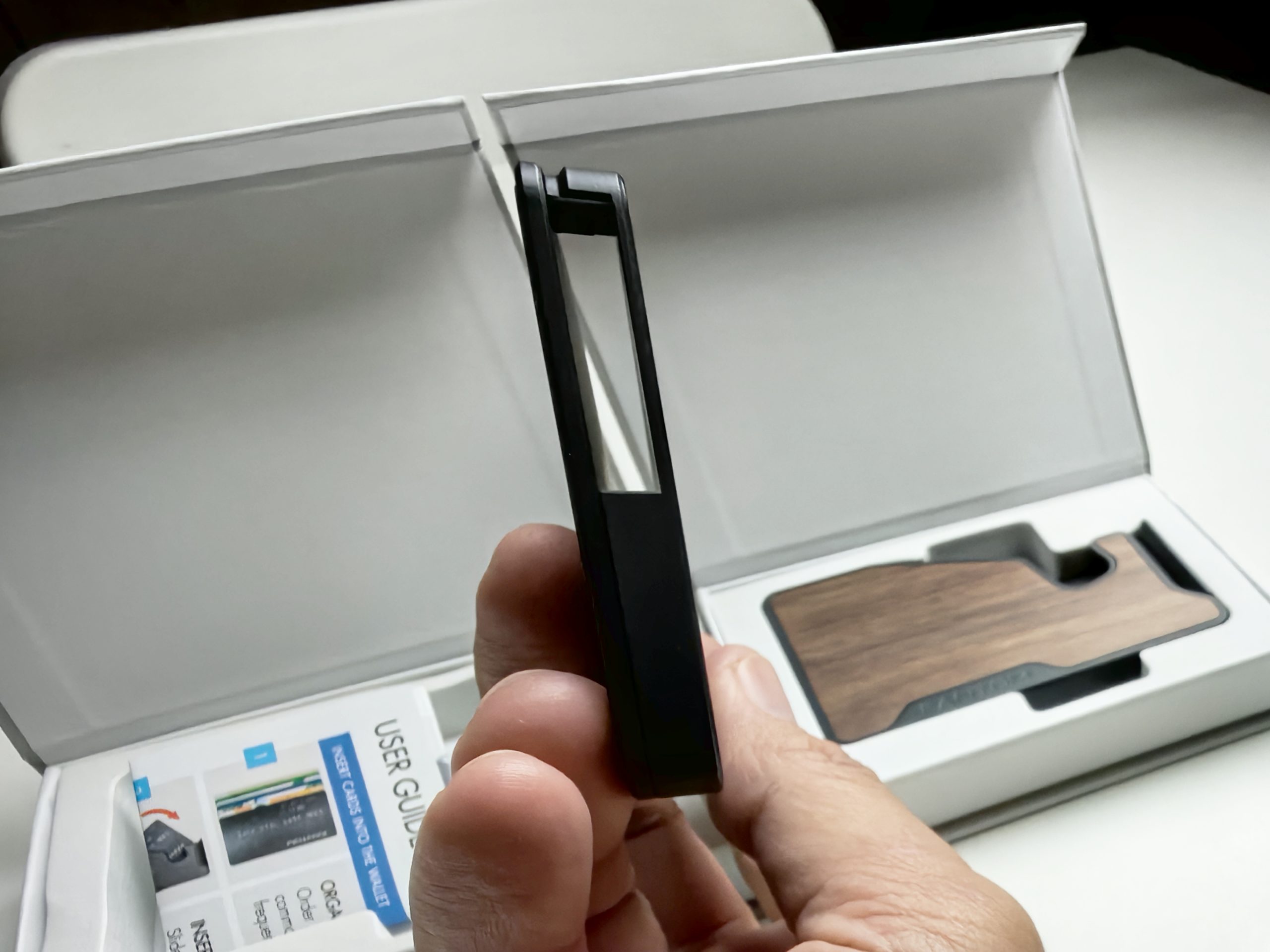 Dompet Fantom M ialah dompet yang sangat anggun dan bergaya. Ia diperbuat daripada aluminium berkualiti tinggi dan mempunyai kemasan berus. Dompet itu sangat tipis, hanya berukuran 0.4 inci tebal. Ini menjadikannya mudah dibawa ke dalam poket hadapan anda tanpa menjadi besar atau tidak selesa.