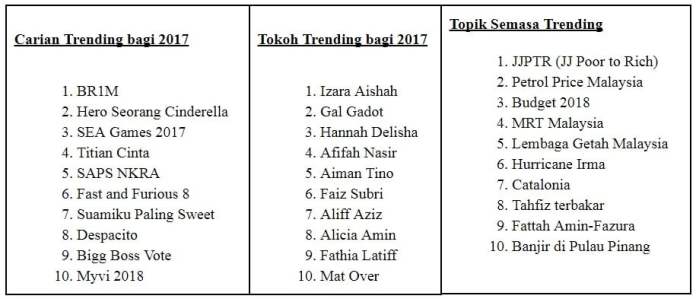 Tempat teratas bagi senarai Carian Trending 2017 adalah milik terma ‘BR1M’, sebuah program bantuan kewangan kerajaan bagi mereka yang berpendapatan rendah. Carian kedua paling trending merupakan ‘Hero Seorang Cinderella’, sebuah drama tempatan hangat, dan carian ketiga paling trending milik ‘SEA Games 2017’ yang merupakan acara pelbagai sukan serantau yang dianjurkan oleh Malaysia pada bulan Ogos lepas. Carian keempat dan kelima paling trending jatuh kepada siri drama tempatan ‘Titian Cinta’ dan ‘SAPS NKRA’, sebuah sistem analisis peperiksaan sekolah awam bagi guru-guru dan ibu bapa.