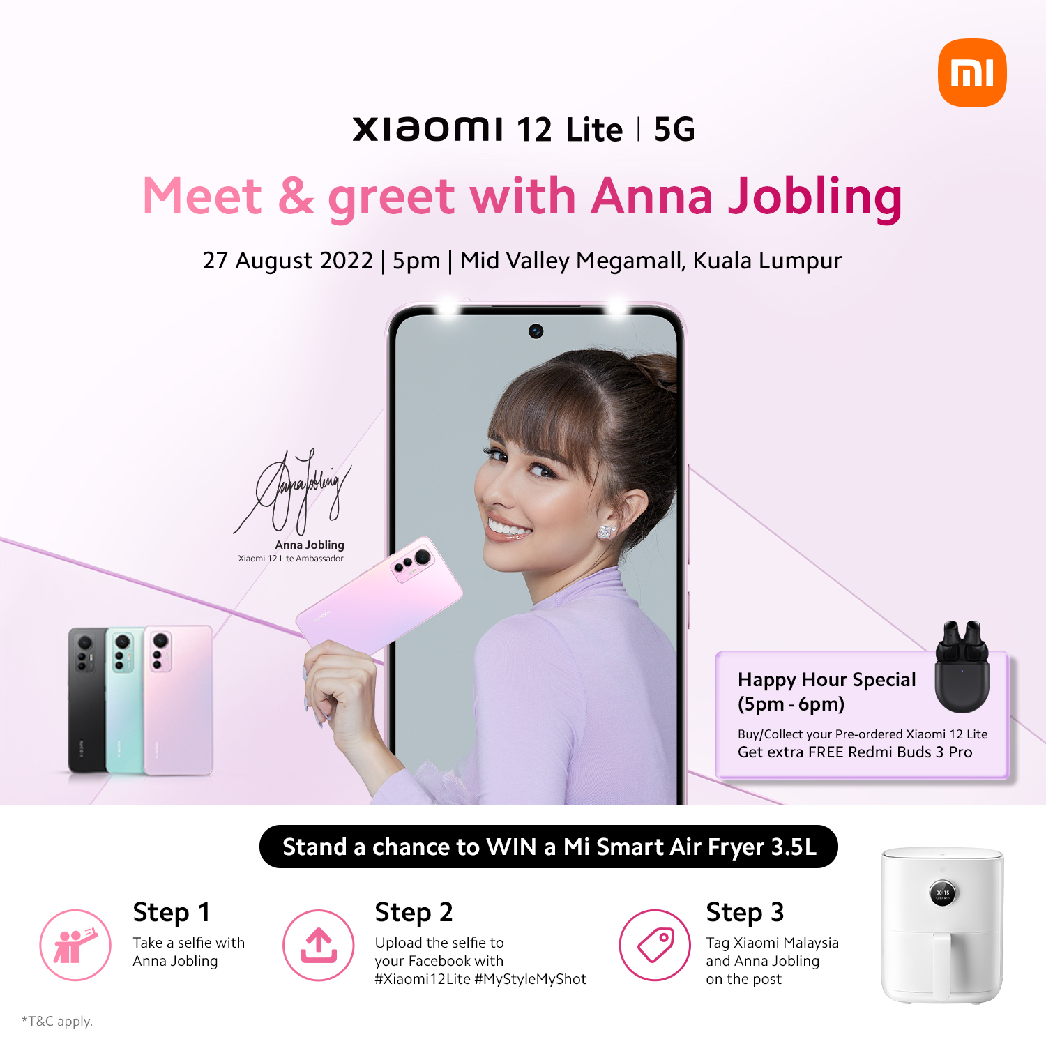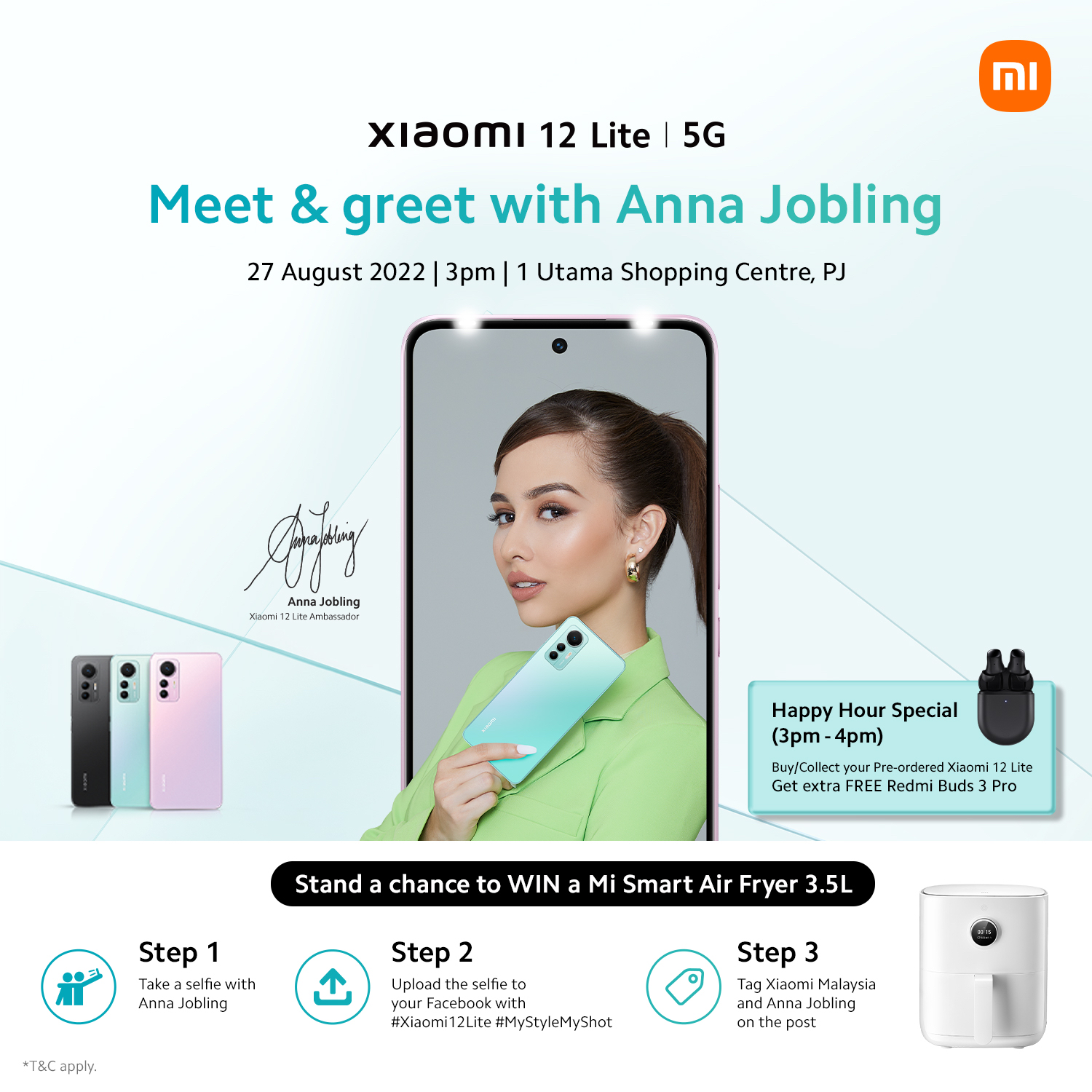 Pada 27 Ogos, peminat dan pembeli boleh bertemu dengan duta jenama Xiaomi 12 Lite , Anna Jobling, secara langsung di Kedai Xiaomi di Pusat Beli-belah 1 Utama, PJ dan Mid Valley Megamall, KL, masing-masing pada pukul 3 petang dan 5 petang. Lawati mana-mana dua kedai Xiaomi semasa sesi bertemu dan sapa dan berpeluang memenangi Mi Smart Air Fryer 3.5L dengan hanya mengambil swafoto dengan Anna Jobling dan menyiarkannya di Facebook.